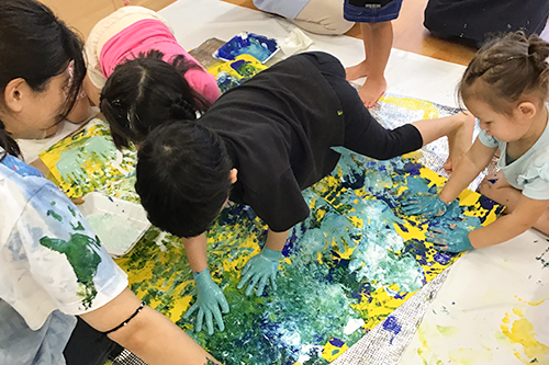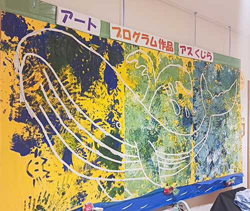 9月のアートプログラムでは、各クラス1枚の作品を仕上げて、最後に繋げると素敵な絵が出てくるというワクワクドキドキな内容となりました。