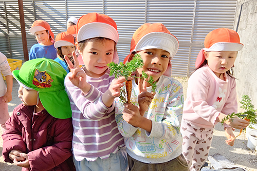 園庭で育てたにんじんを収穫し、