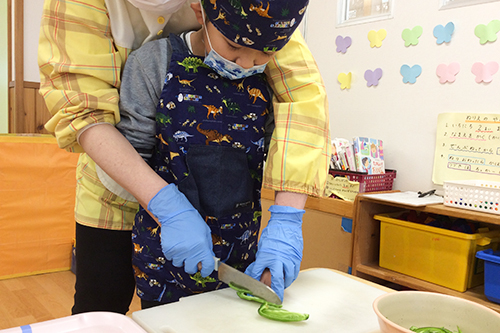 5歳児クラスは包丁を使ってピーマンを切ります。