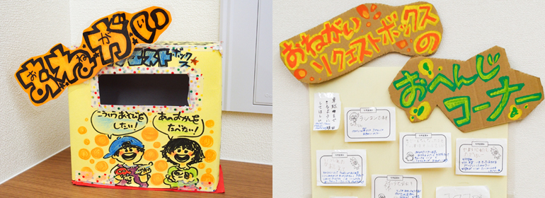 こどもたちが気づいたことや「こんなことやってみたい!」を自由に書いて投函できるリクエストボックスを設置しています。集まった声は施設づくりにしっかり反映され、こどもたち自身が運営に関わる大切な仕組みになっています。